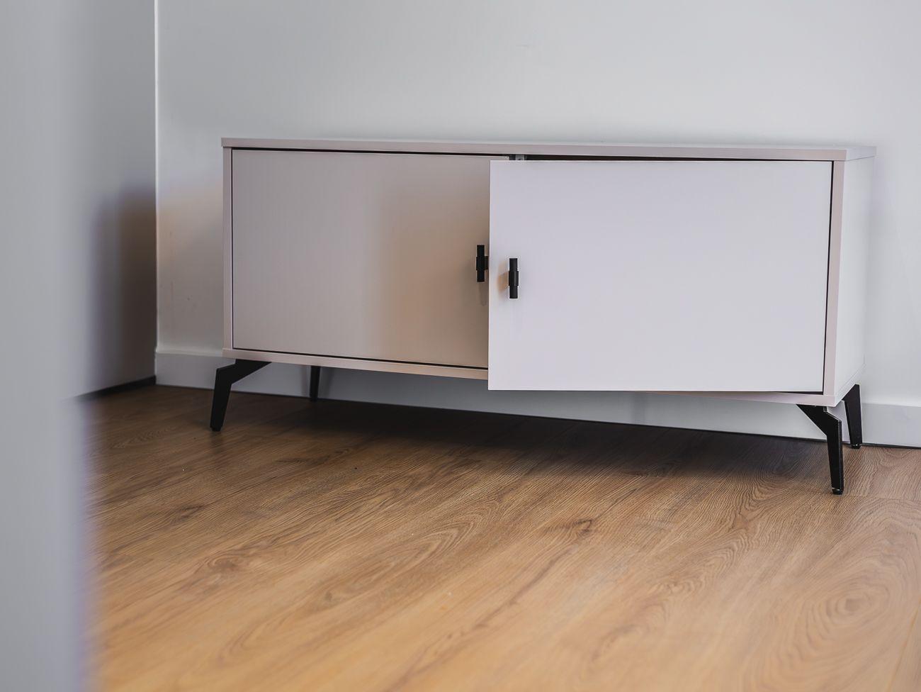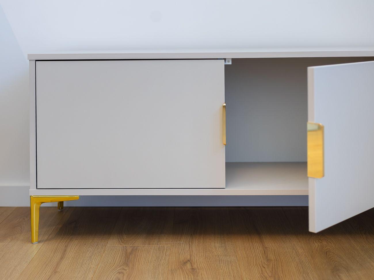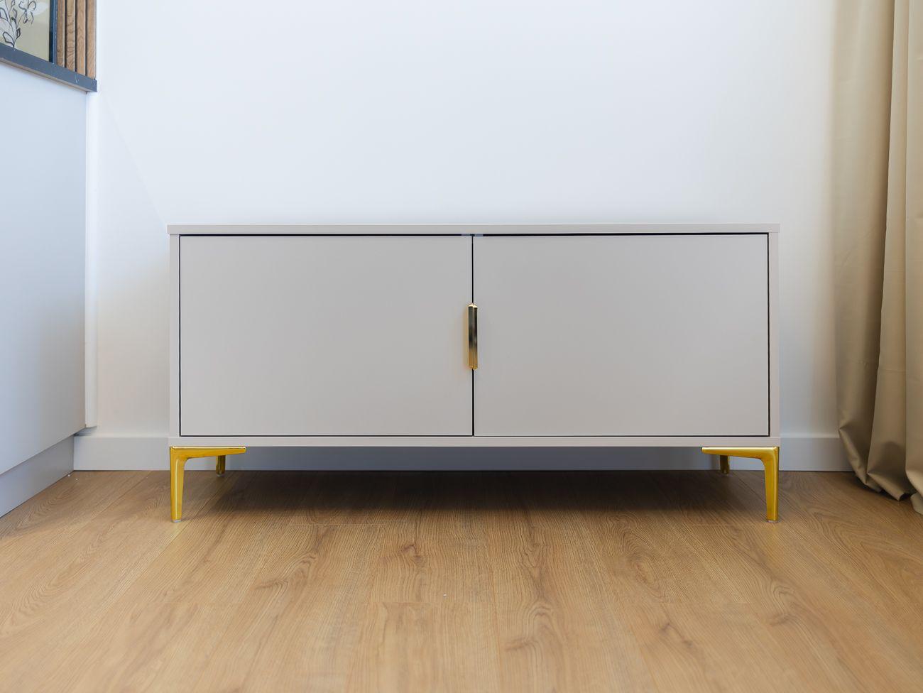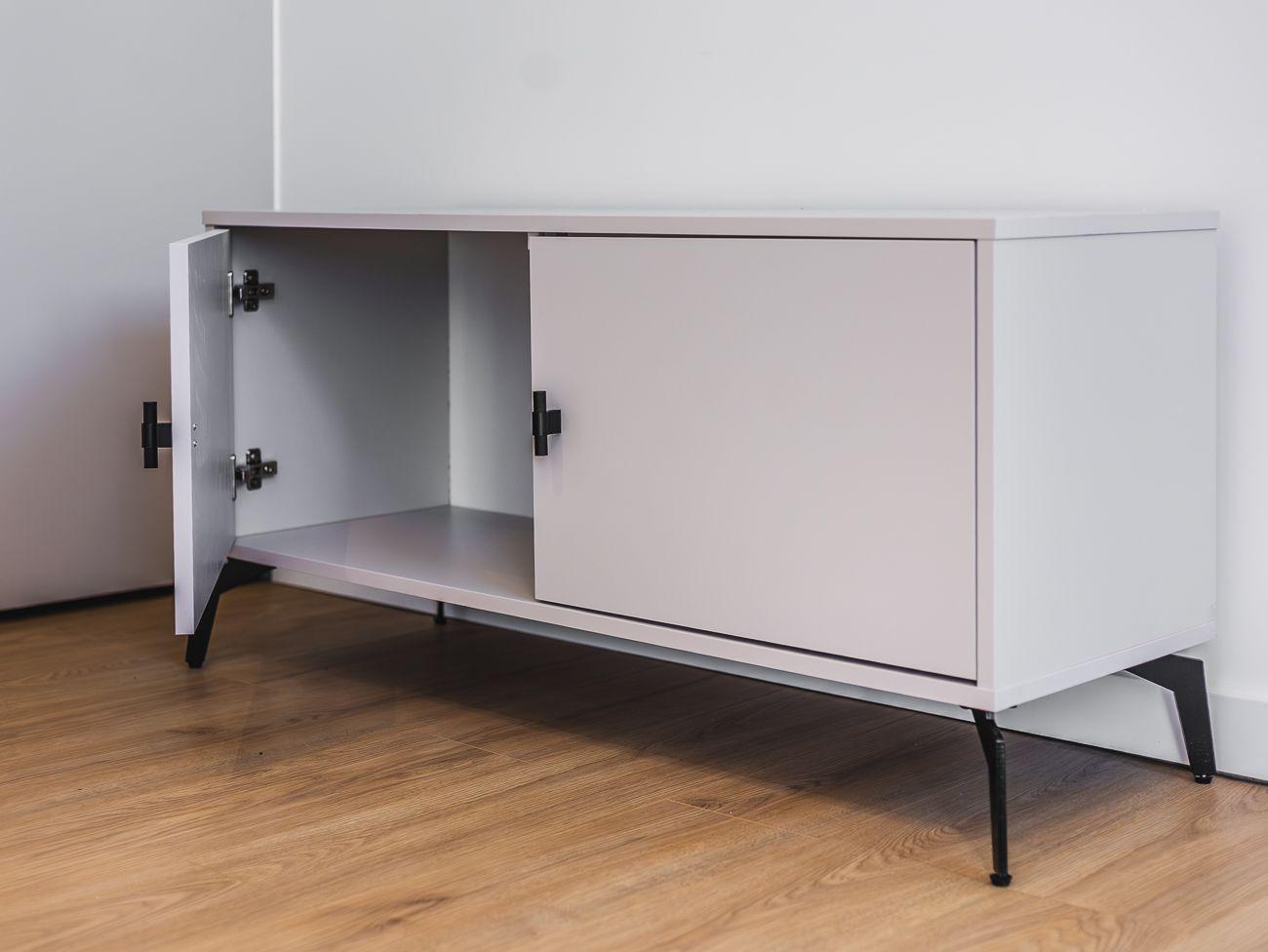 Ponadto szafka dostępna jest w dwóch eleganckich kolorach – czerni i subtelnym kaszmirze. Wykończenie niezależnie od wybranego koloru zawsze jest matowe. Szafka ma 120cm szerokości i 55 cm wysokości. Głębokość, jak w większości naszych mebli wynosi 40cm. Kompaktowy rozmiar czyni ją idealnym wyborem do każdego pomieszczenia. Świetnie sprawdzi się jako szafka RTV, niska komoda lub funkcjonalny mebel do przedpokoju.